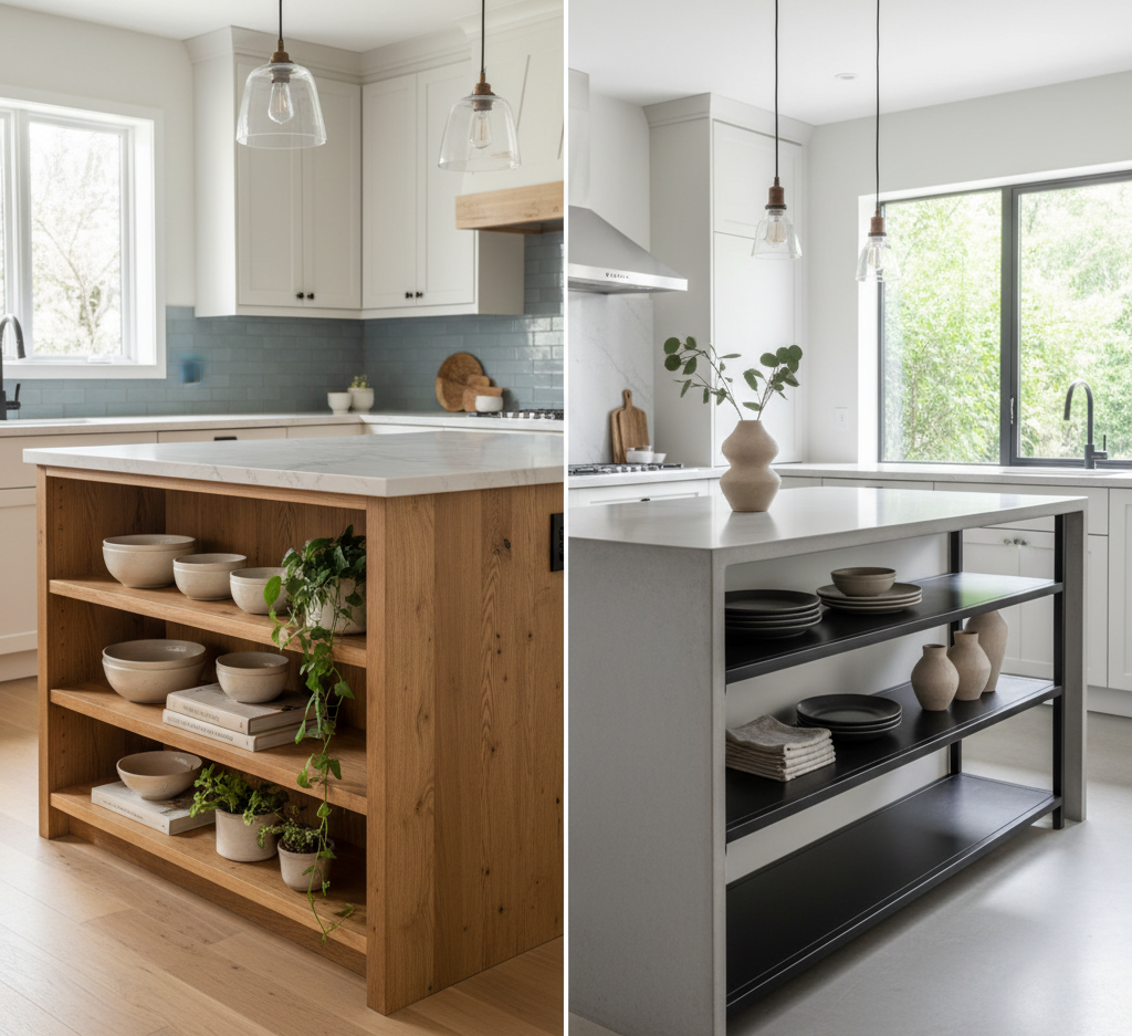Open shelves make your island useful and pretty. You can show books, bowls, or plants. It gives life and colour to the kitchen. Shelves on the side save space and keep the top clear. Use wood for warmth or metal for a clean style. Change what you display with the seasons. It is easy to decorate and easy to reach. This idea keeps your island neat, lively, and personal.