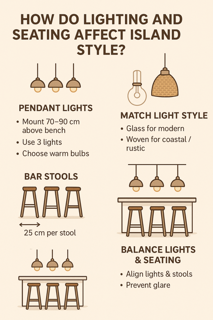 Lighting and seating change how your kitchen island looks and feels. They can make it warm or dull. Getting both right makes your island a place people love to sit around.