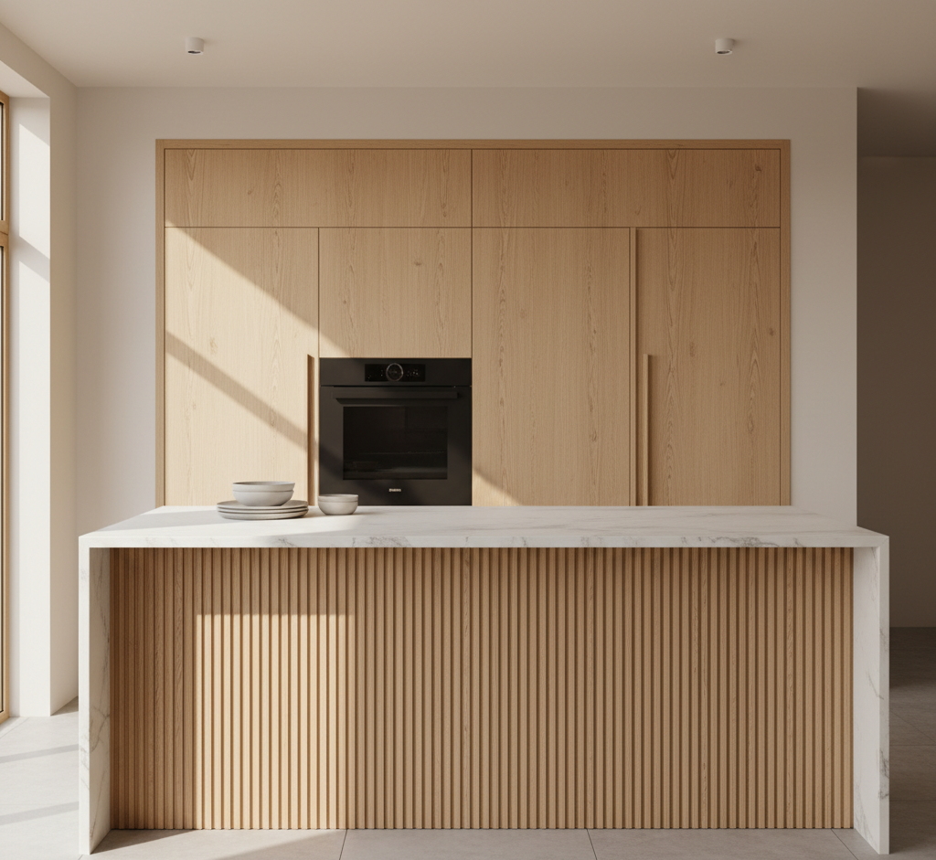 Reeded panels have fine vertical lines that add gentle texture. They catch light and shadow nicely. The look feels elegant and calm. Use light colours to show the pattern or dark ones for depth. You can use timber, glass, or painted panels. This style works in both modern and classic spaces. Pair it with a smooth benchtop to keep balance. It adds quiet beauty without clutter.
