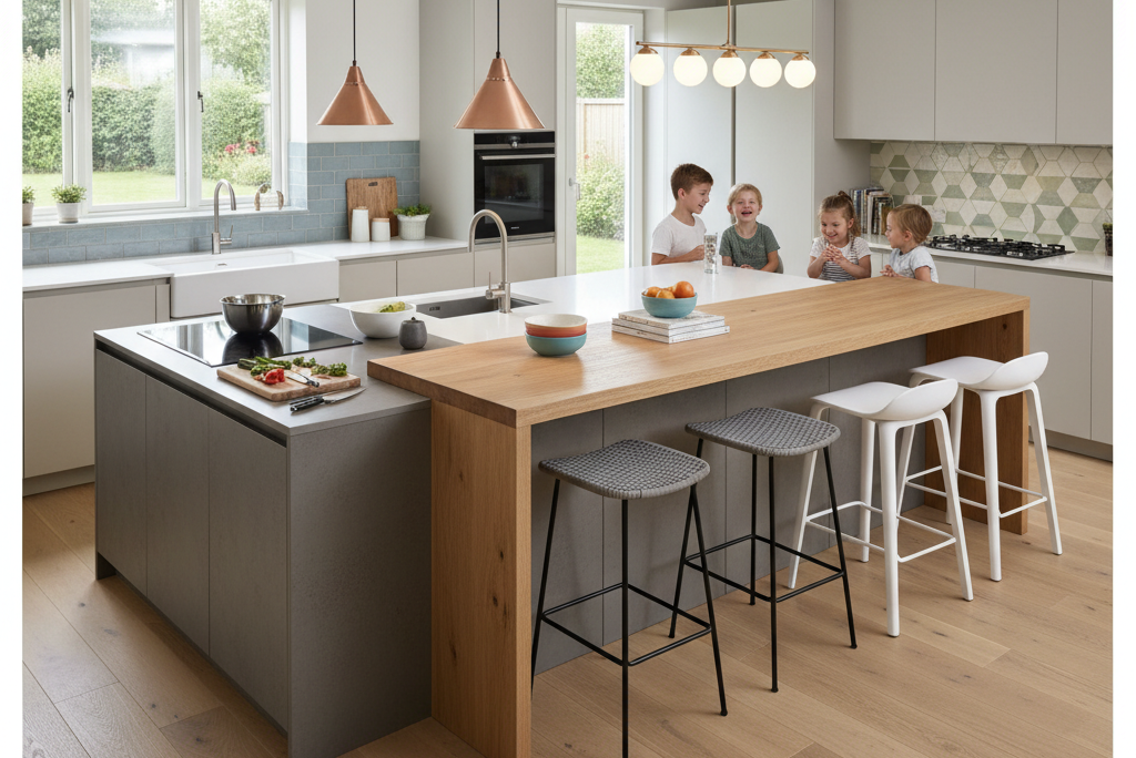 A split-level island has two heights, one for cooking and one for sitting. It makes your island more useful. The lower level can be for prep and the higher one for meals. You can mix materials or colours for each part. It helps separate work and dining areas while staying together. Add simple lights and stools to finish the look. It is great for families or guests, keeping the kitchen active and friendly.