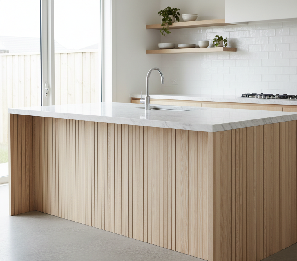 Timber battens make your island warm and full of life. Add thin wood slats on the front or sides. They give texture and a clean look. Light timber feels soft and coastal. Dark timber adds depth and contrast. This design fits in both new and classic kitchens. Timber also hides scuff marks and adds charm. It looks best with stone or white tops. Simple but rich, it makes your island look warm, neat, and natural.